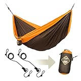 Sie ist mit 349 g eine der leichtesten hier vorgestellten Hängematten. Insgesamt kann sie mit bis zu 150 kg belastet werden. Dadurch können auch zwei leichte Personen (jeweils 70 kg) problemlos in ihr Platz nehmen. Die verwendete Fallschirmseide wirkt angenehm und nicht störend auf der Haut. Insbesondere wenn man plant häufig in der Hängematte zu schlafen, ist diese Eigenschaft besonders wichtig.